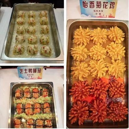 自2014年开始开展上海高校创新菜肴、创新点心比赛以来,上海高校后勤相关部门纷纷开展“积极钻研烹饪技术,努力提高餐饮服务质量,保障师生健康饮食”活动,师生不出校门即可吃到可口美味的菜肴和做工精美的点心。我校在该项赛事的首届比赛中就曾有3道菜肴斩获金奖,本次比赛的参赛菜肴品种更是突出可操作性、推广性、营养性和普及性,共有来自沪上37所高校的100多位选手献上了111道佳肴。