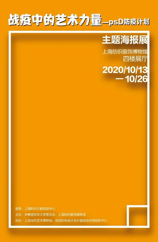 10月13日,“战疫中的艺术力量——psD防疫计划”主题海报展将于上海纺织服饰博物馆四楼展厅开展。展出“psD防疫计划”项目中13位/组设计师的14件海报作品,欢迎观展!