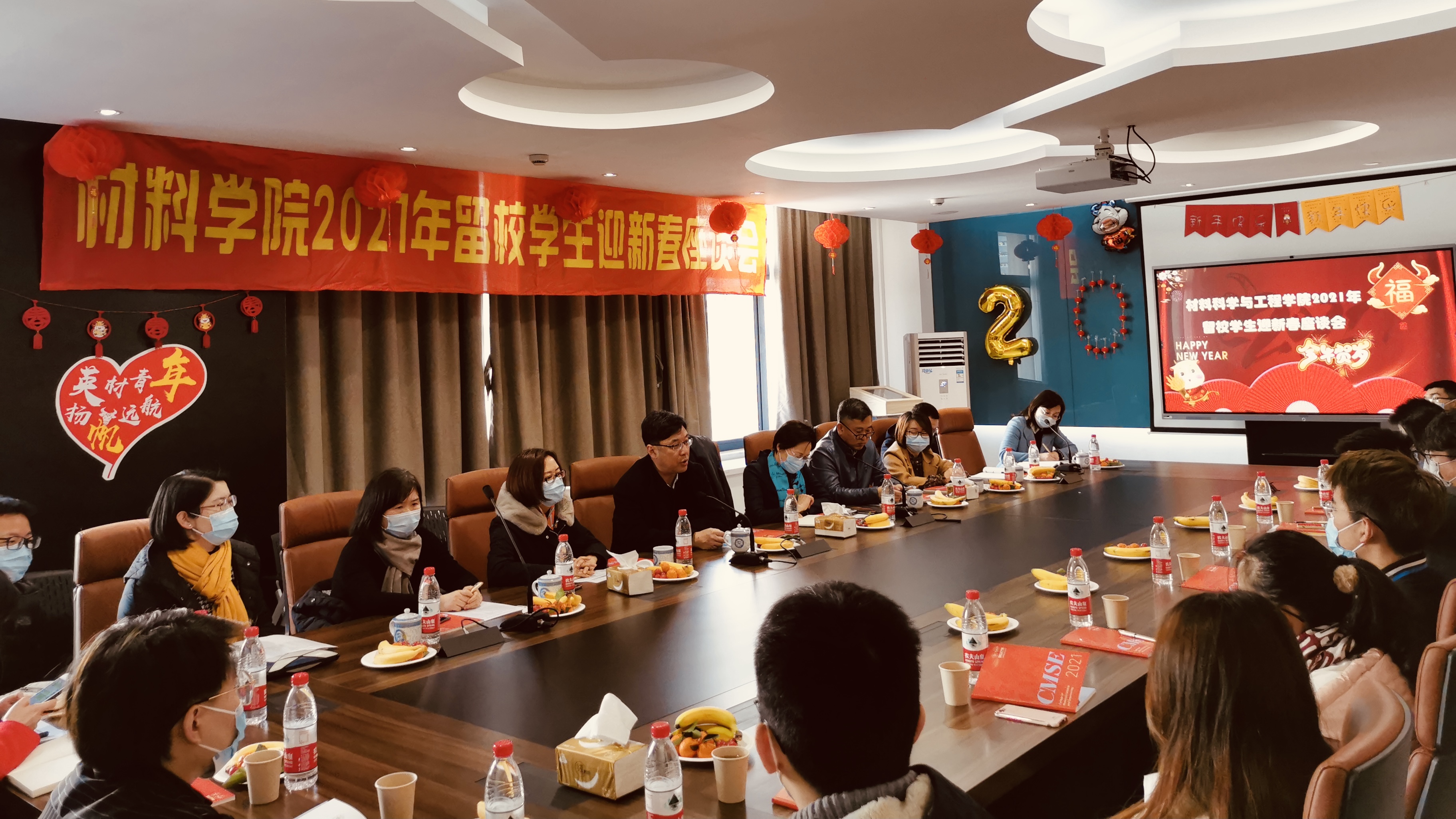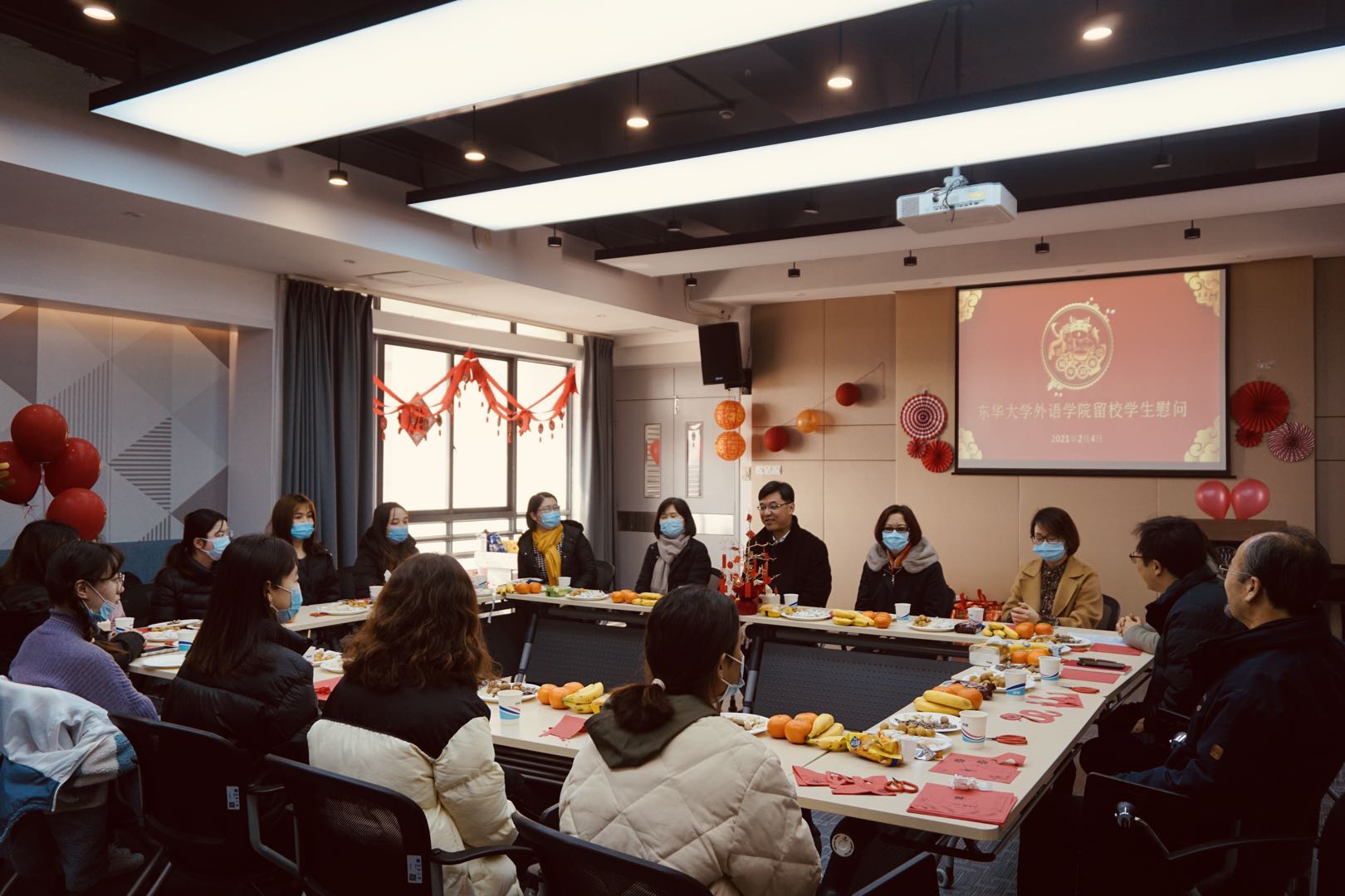 慰问座谈现场,校领导与师生们亲切交谈,分享着思乡的苦、奋斗的甜,满怀憧憬地展望着来年的路,要做牛气冲天的东华人!剪一张或圆或方的窗花、写一副或长或短的春联,同学们向校领导展示了原创牛年春联、剪纸作品,送上祝福。校领导为同学们发放新年礼包,勉励大家勤奋刻苦,再创佳绩。在浓浓的年味儿中,大家与吉祥“小红牛”合影,共迎新春佳节的到来。