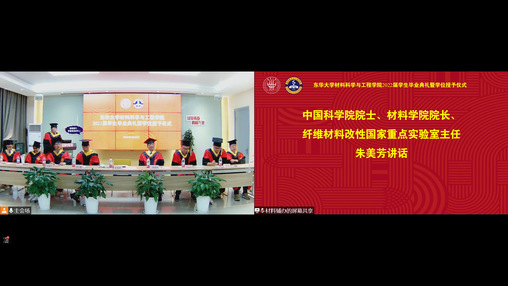 陪伴毕业生学习成长的师友为毕业生们送上殷切嘱托与暖心祝福。材料学院院长、中国科学院院士、纤维材料改性国家重点实验室主任朱美芳寄语毕业生胸怀祖国,不负人民;勇立潮头,担当作为;创新创造,敢为人先;始终牢记党的教诲,立志民族复兴,在青春的赛道上奋力奔跑,争取跑出当代青年的最好成绩。服装学院教师代表彭波回顾自己从毕业到工作的经历,嘱托毕业生们感恩父母,感谢国家和给予过帮助的人,寄语毕业生坚持梦想、热情奋斗,学会爱别人、爱自己。管理学院毕业生代表王荣松讲述了求知与钻研的东华路,他说,在这里深刻理解到了科研人员对科学真理的执着追求和对服务国家战略需求的情怀责任。化工生物学院在校生代表徐晓清祝福学长学姐毕业快乐,感谢为人为学为事的指引帮助,期待共同努力向着光坚定前行。