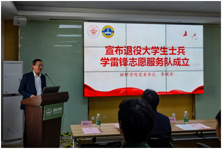 3月7日,材料学院举行退役大学生士兵学雷锋志愿服务队成立仪式,学院党委书记李斌荣、校团委书记秦泽峰、学院党委副书记莎日娜、专职辅导员以及全体服务队队员和学生代表等参加活动。